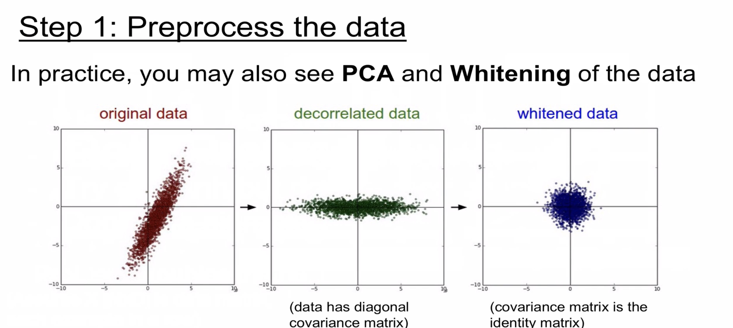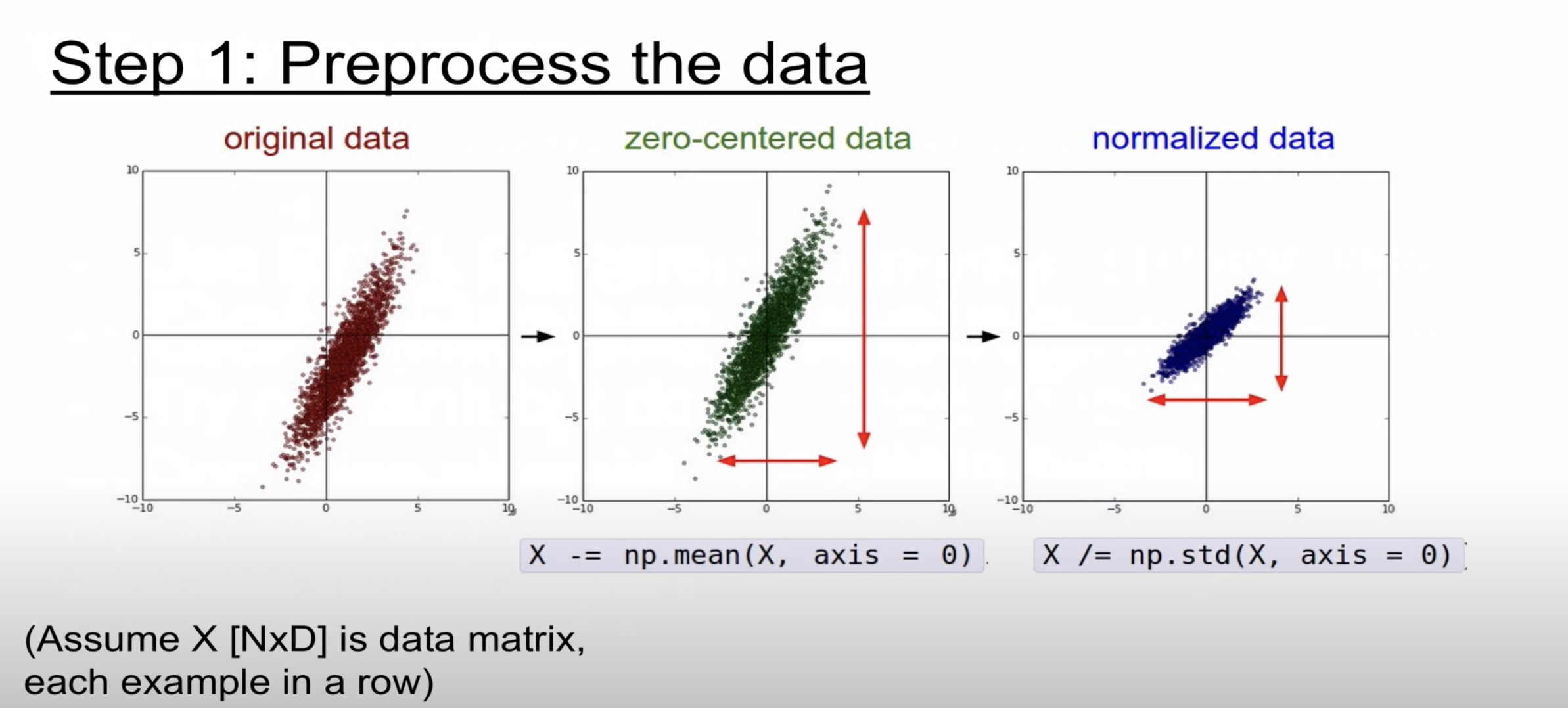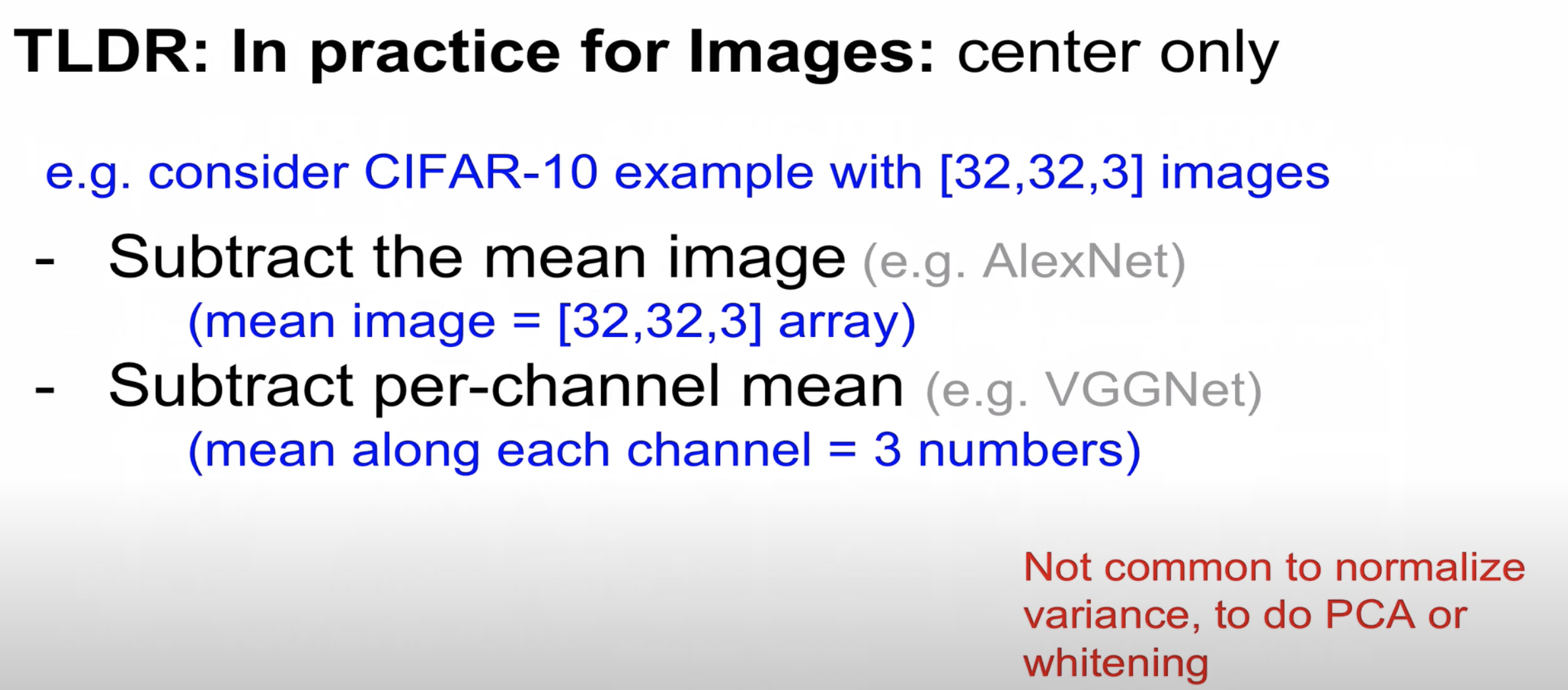 이미지의 경우 PCA(차원축소)와 Whitening(이미지의 중복성을 줄여주는 역할)을 일반적으로 해주지 않는다