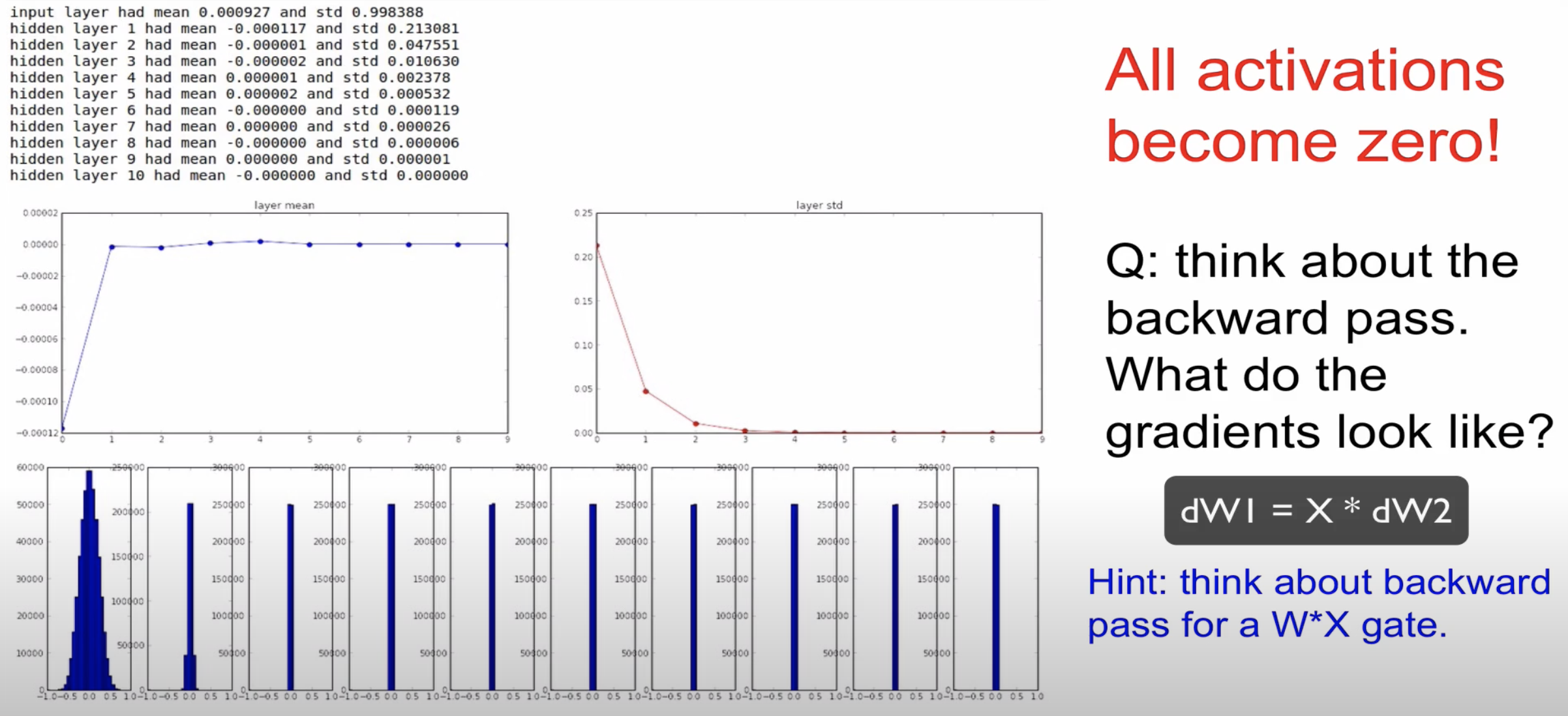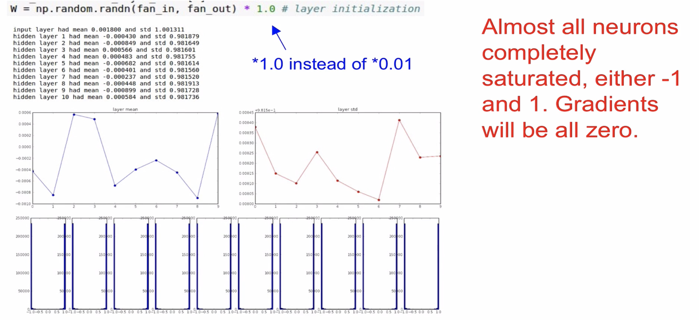 이번에는 W가 0.01이 아닌 1을 주게 되면 -1과 1로 변하게 되어 gradient도 그 값이 0이 되어버린다