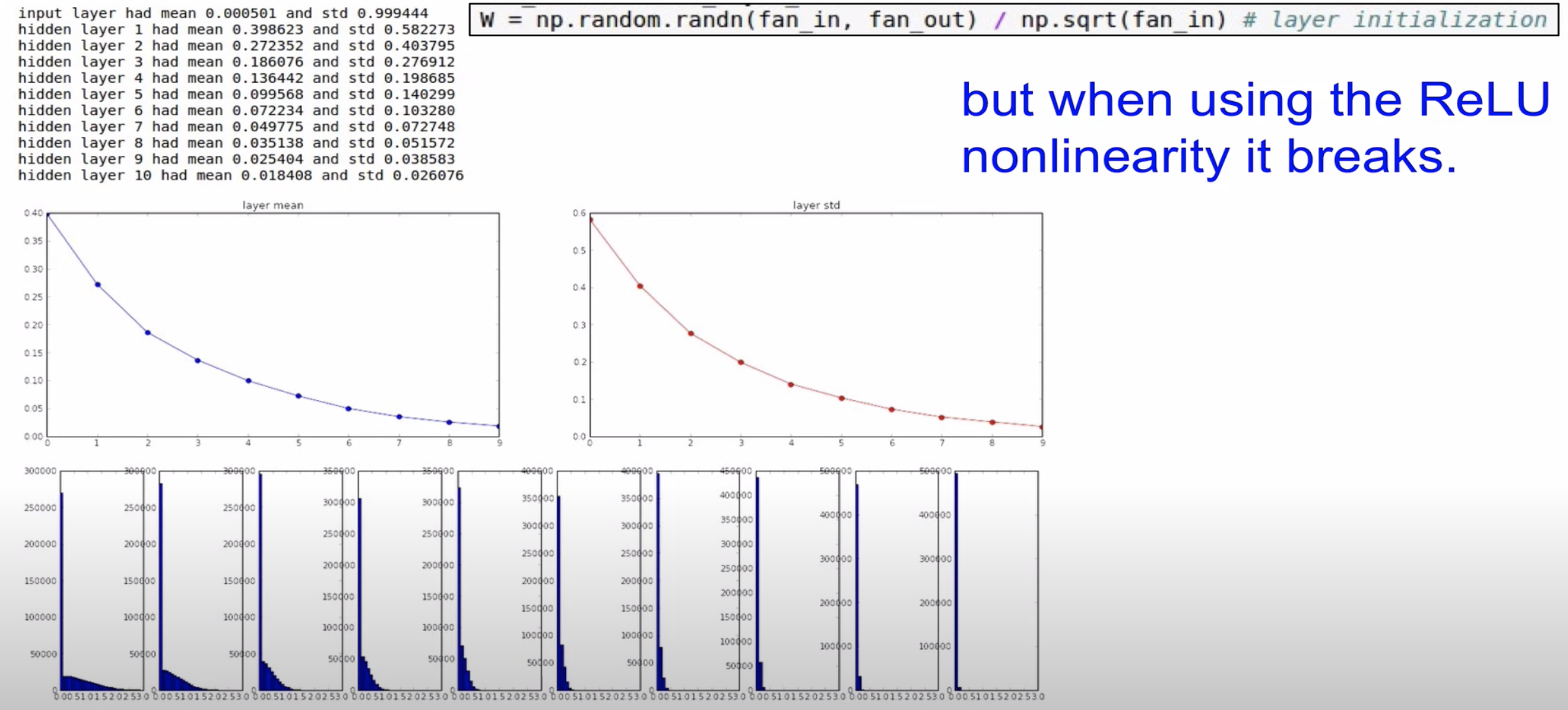 tanh의 대해서는 W가 합리적으로 초기화 되었지만 Relu에서 문제가 발생하였다