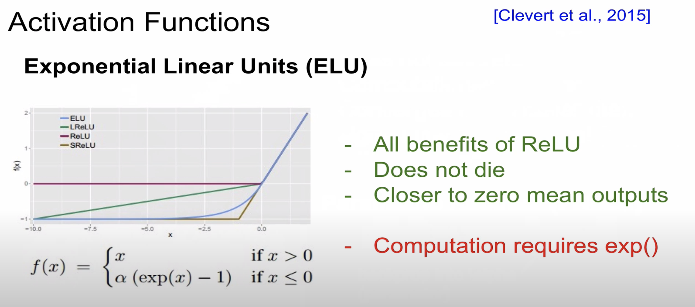 - 일반적인 ReLU와 달리 exp함수를 계산하는 비용이 발생한다.(exp 함수 자제가 연산량이 많다)