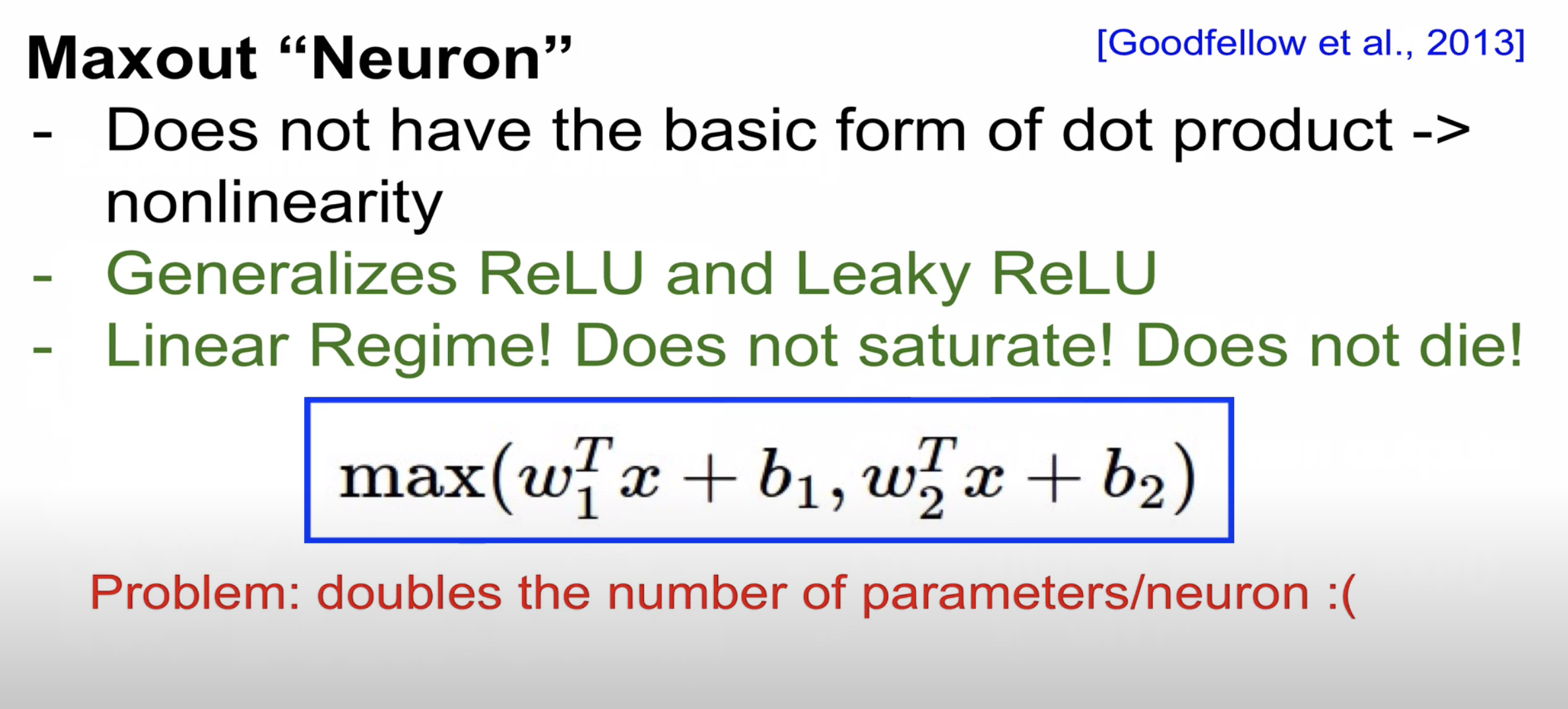 max(w1 . w2)가 있는데 일반적으로 하나의 뉴런은 하나의 w만 가지기 때문에 Maxout의 경우 연산량이 많습니다