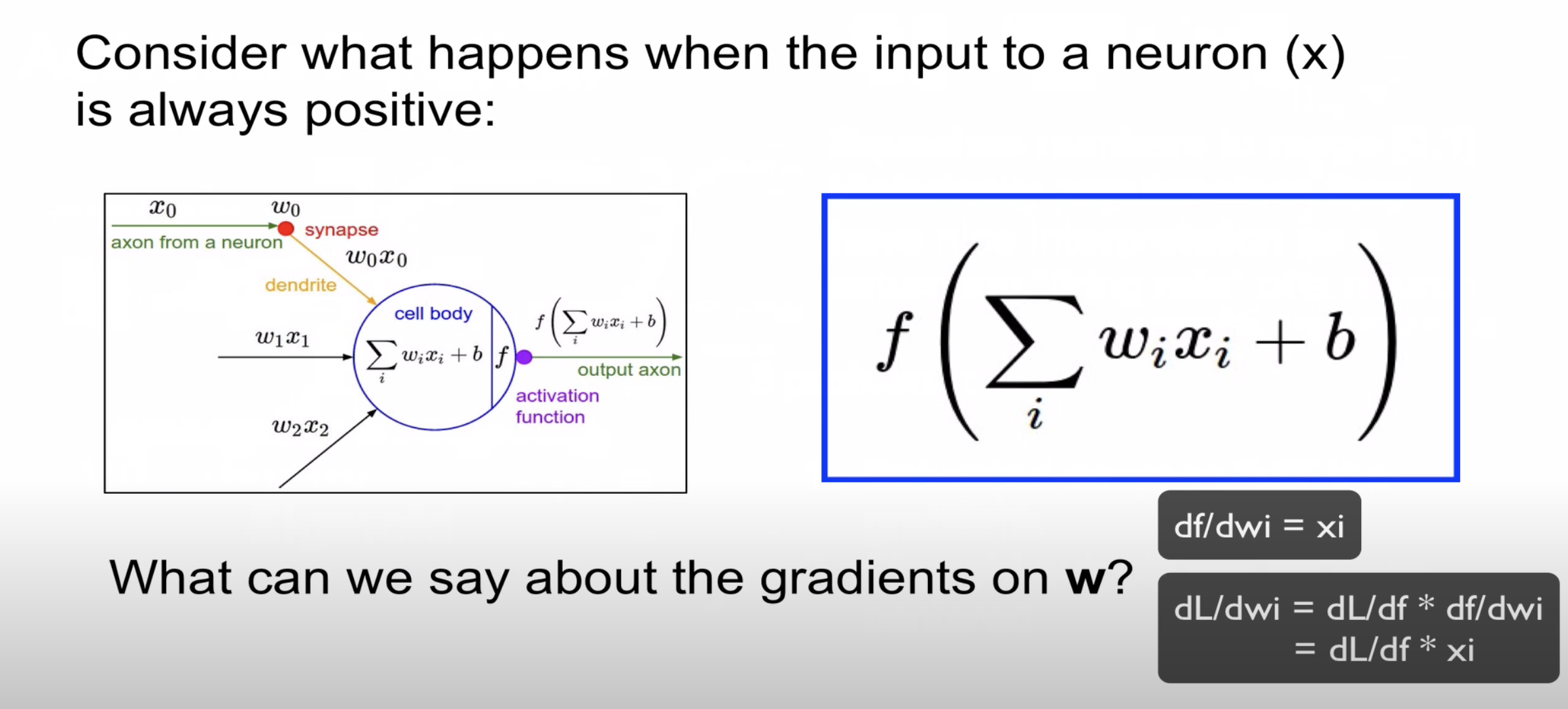 dL/dwi을 편미분 형태로 다시 분해를 하게 되면 dL/df * df/dwi가 나옵니다 여기서 df/dwi는 xi로 항상 양수입니다