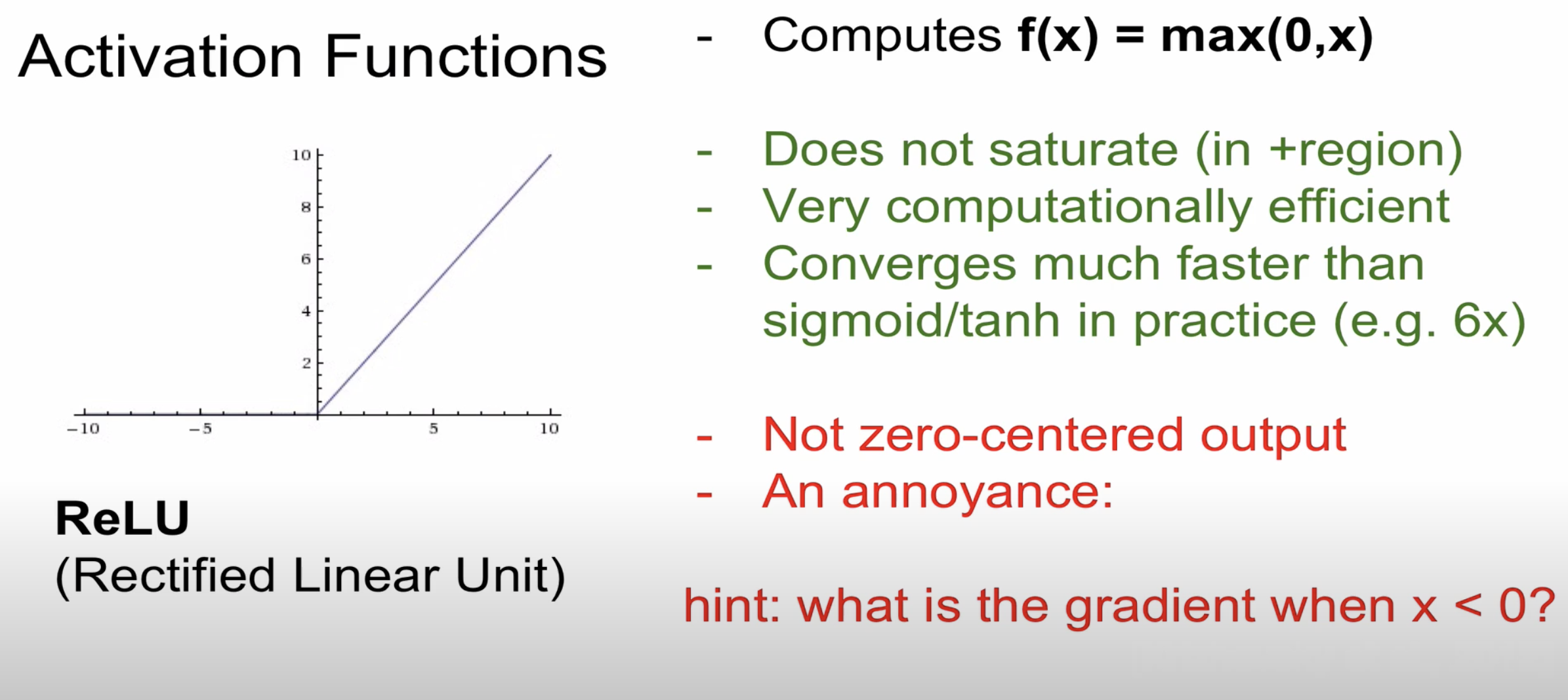 - sigmoid, tanh 함수와 비교시 학습이 훨씬 빨라진다