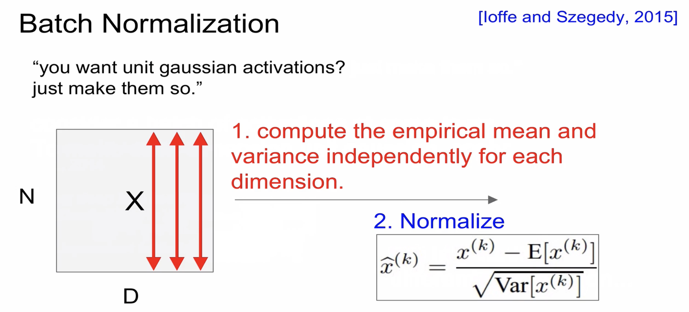 N은 데이터 수 D는 feature 수로 미니배치를 뽑아서 평균과 분산을 계산하여 정규화를 해준다