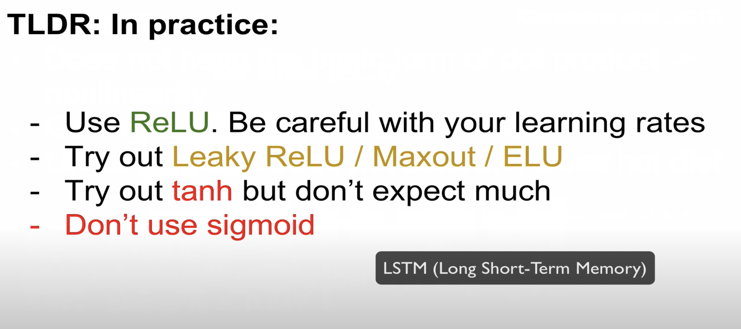 2. 실험이 필요한 경우 Leaky relu / Maxout / ELU 사용합니다
