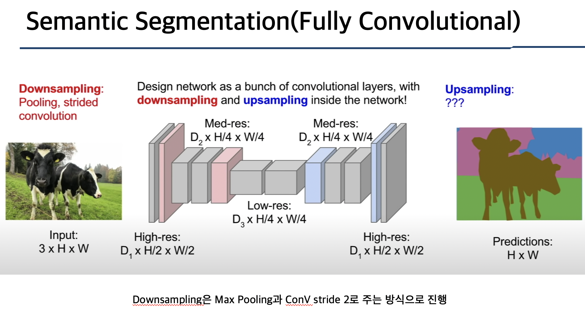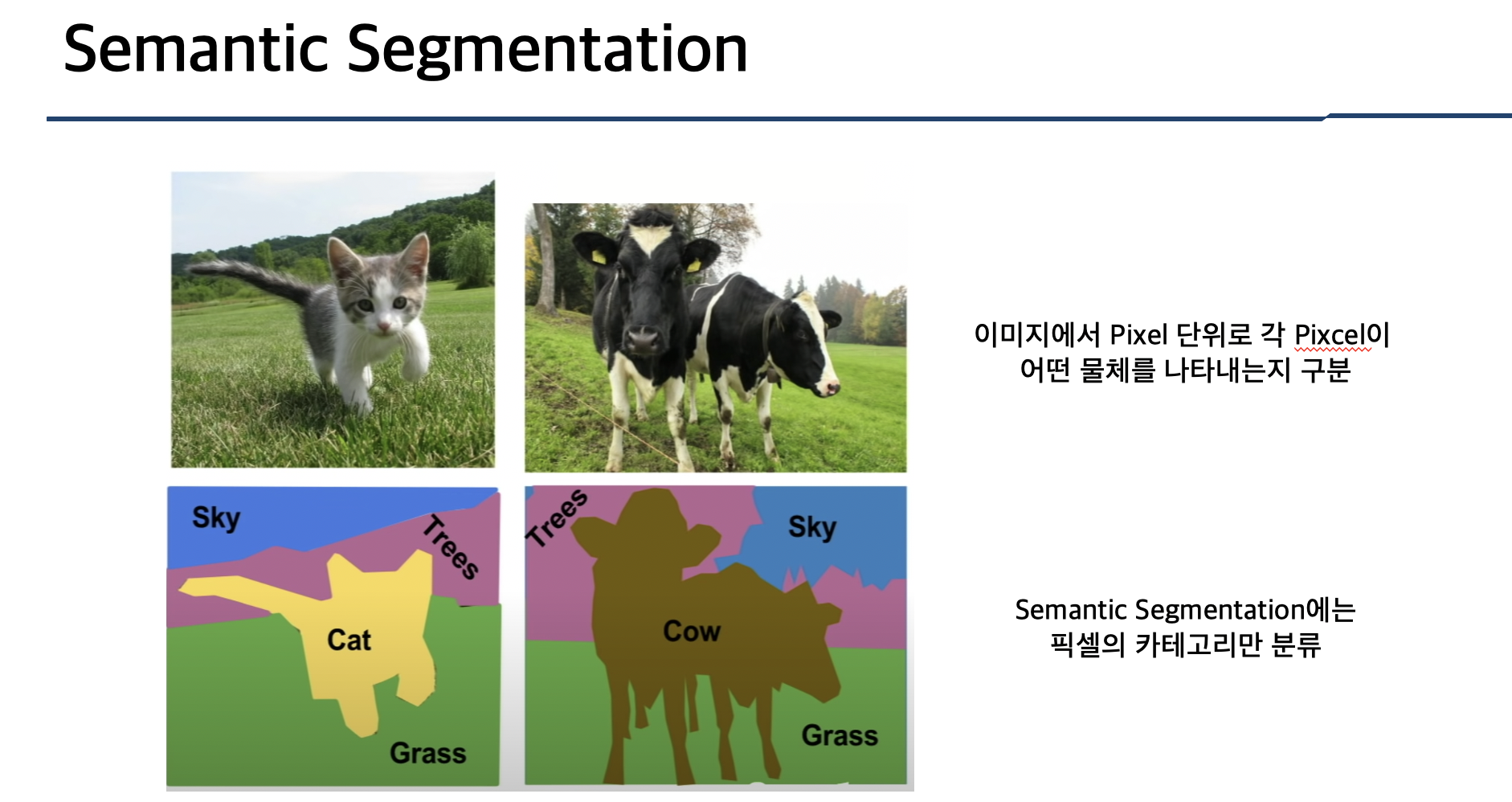 픽셀을 분류하는 것이며 Semantic의 의미는 암소 2마리의 경우 각각의 암소를 구분하지 않고