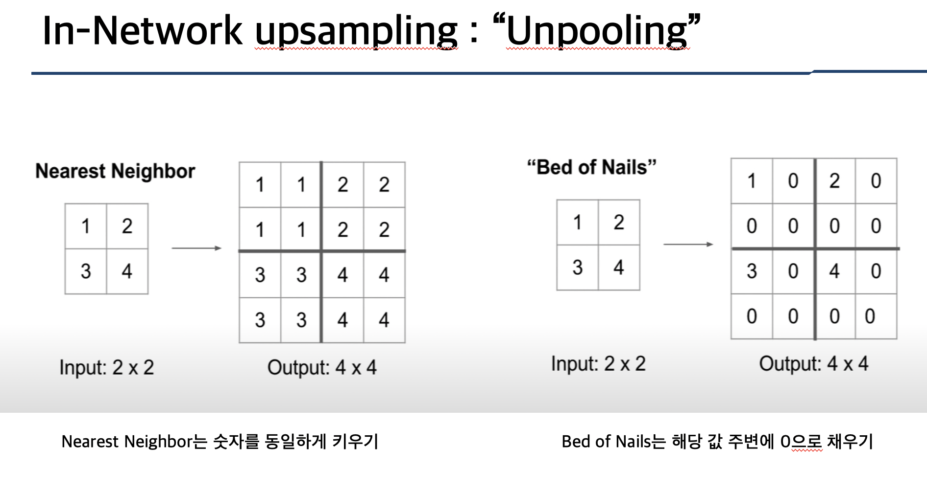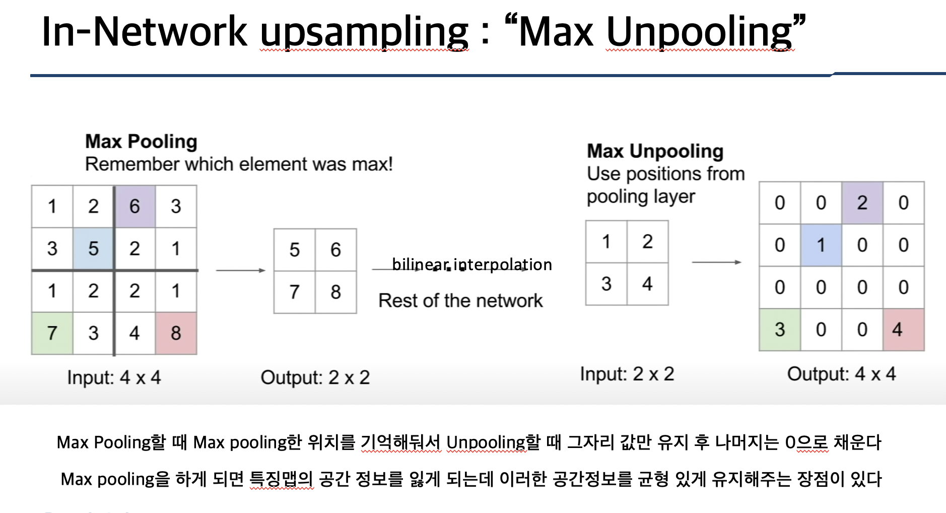 upsampling 중 첫 번째 방법은 Unpooling으로 사진을 참고하시면 될 것 같습니다