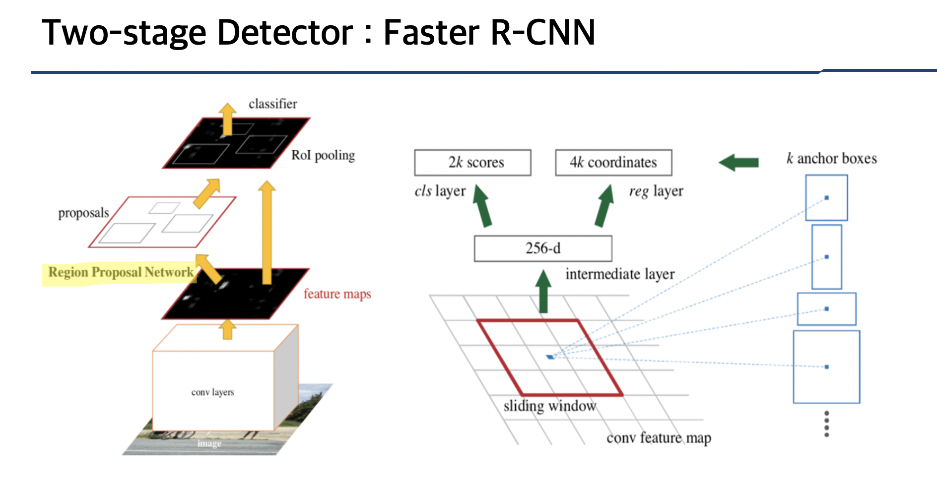 Faster R-CNN는 RPN을 통해 Region proposal과 분류, 위치(좌표값)를 하나의 네트워크 안에 넣습니다