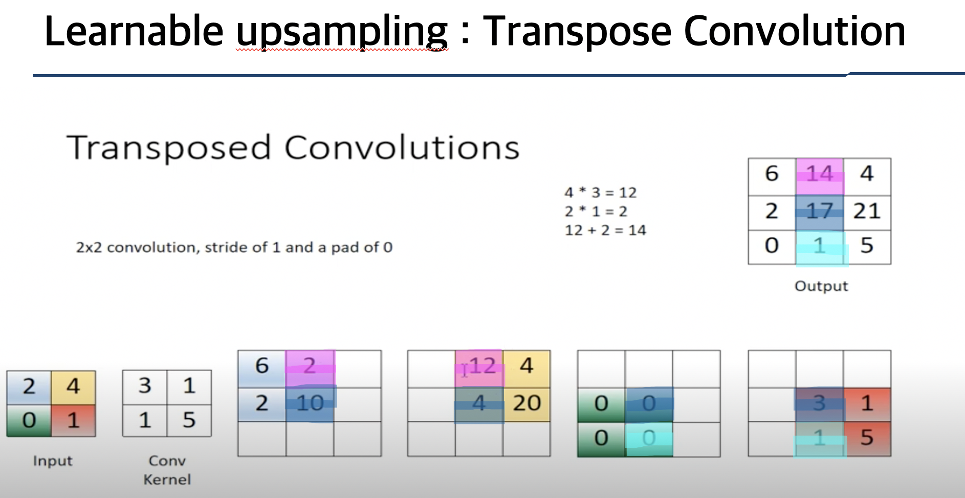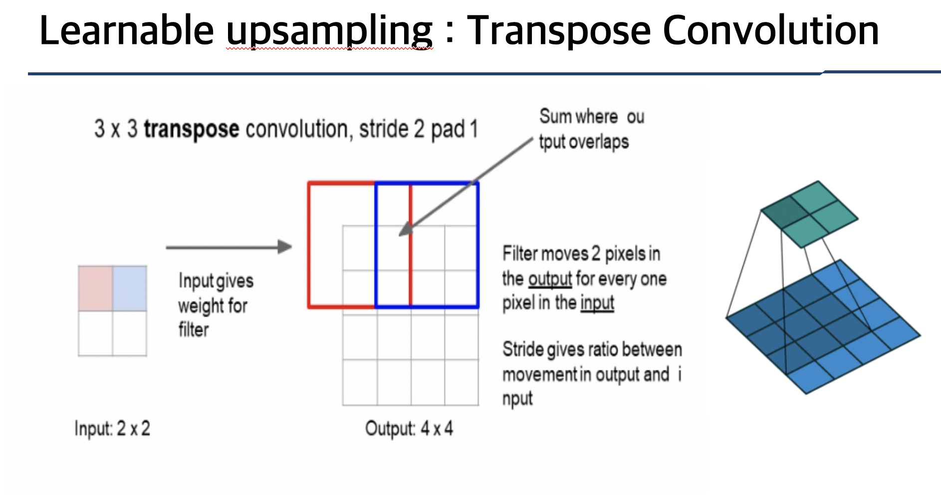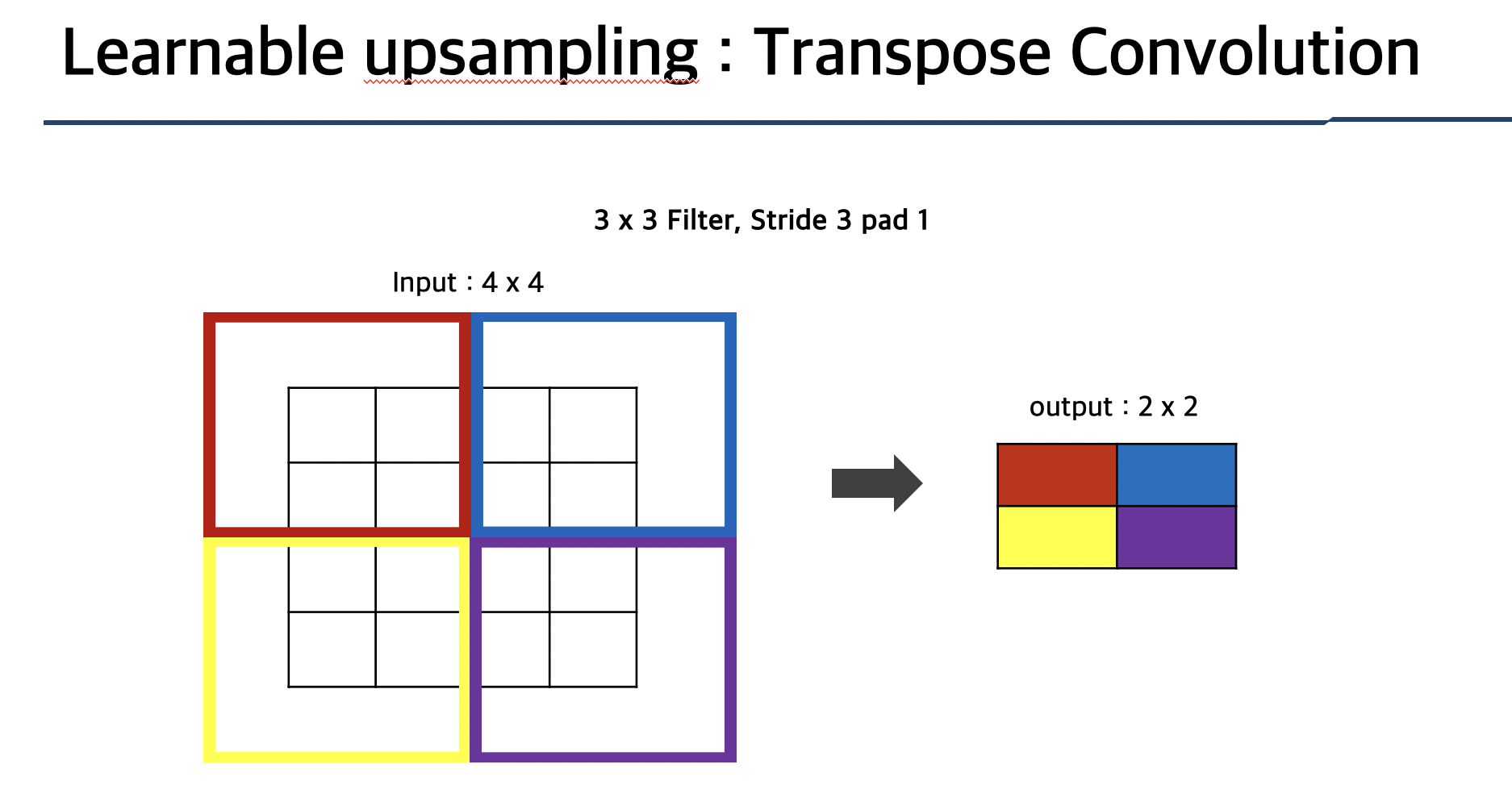 Transpose Convolution은 Input의 가중치 filter를 곱해 Output의 크기를 늘리는 방법입니다
