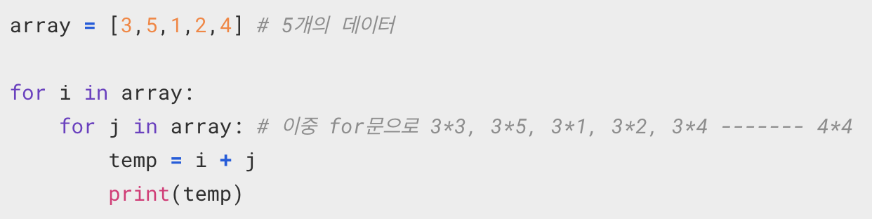 이 소스코드는 데이터의 개수(array 리스트 변수의 길이)가 N개일 때, O(N2)의 시간 복잡도를 가진다